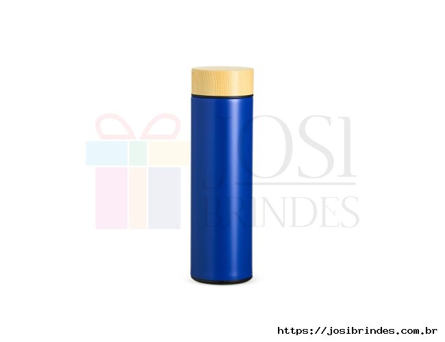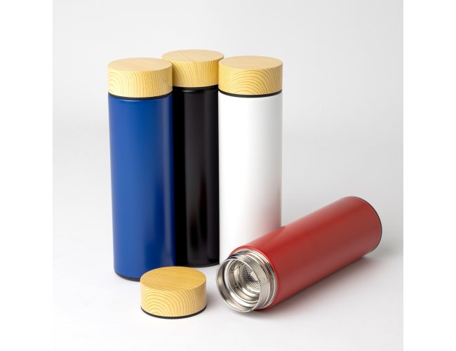 Descrição: Garrafa térmica 450ml em inox com parede dupla, infusor e tampa rosqueável com detalhe plástico estilizado de madeira.