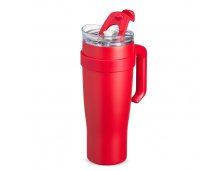 Caneca em inox de 470ml. Possui tampa com vedação, bocal com trava de segurança e pegador de plástico.